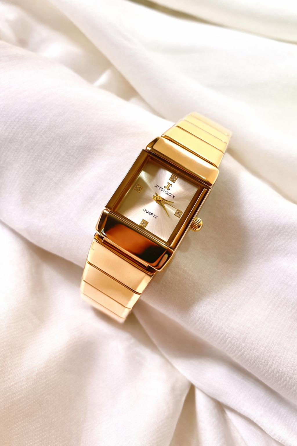 Cette montre féminine au design rectangulaire intemporel est fabriquée en acier inoxydable doré, offrant à la fois élégance et résistance. Son cadran clair et minimaliste, sublimé par des détails dorés raffinés, apporte une touche de sophistication discrète.
